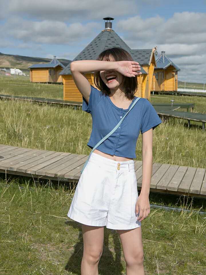 韩范2018新款纯色排扣圆领修身显瘦短袖T恤女夏百搭休闲短款上衣