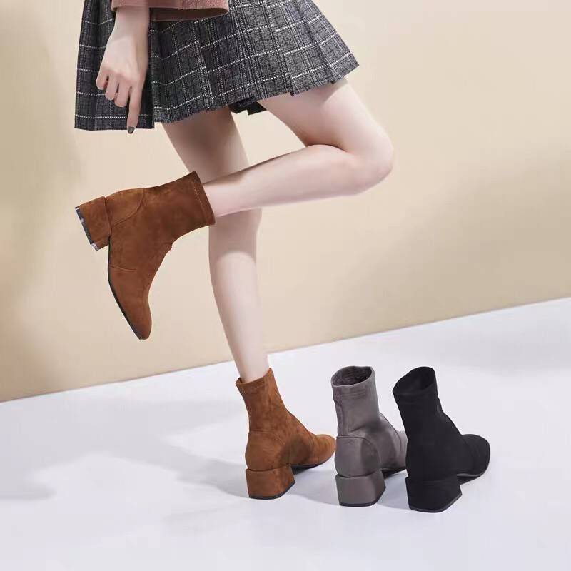 2018新款中跟瘦瘦靴粗跟加绒短靴绒面ins网红款弹力女靴冬潮靴子