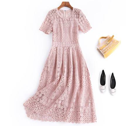 欧美粉色蓝色蕾丝连衣裙中长款2018新款高腰圆领短袖修身显瘦a字