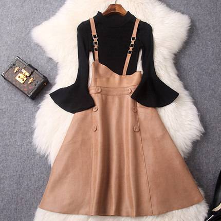 2018早秋女装新款套装纯色喇叭袖针织衫+麂皮绒背带连衣裙两件套