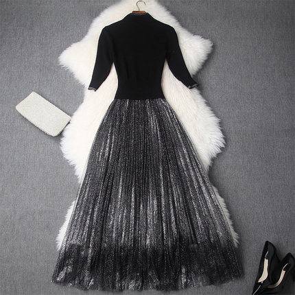 2018秋冬女装新款半高领中袖针织A字裙拼接百褶网纱假两件连衣裙