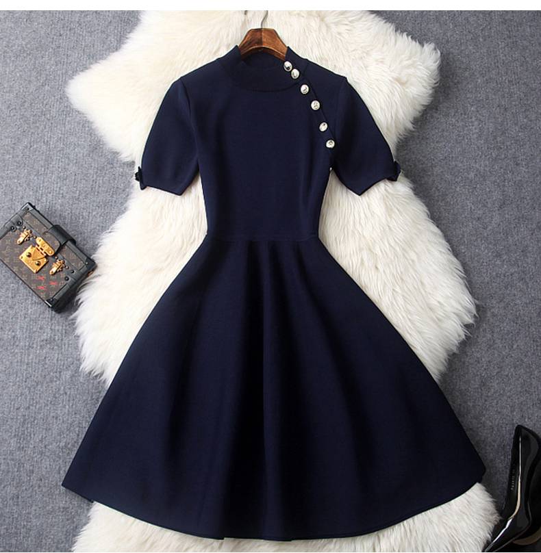 秋装女2018新款针织连衣裙半高领长袖金属纽扣小香风纯色圆领女装