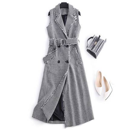 千鸟格须须边翻领背心裙2018秋装新款女装复古腰带马甲外套中长款