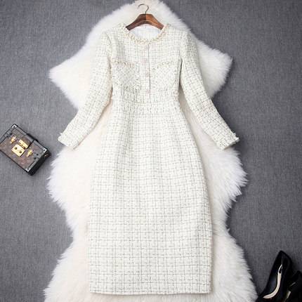 秋装女2018新款毛呢格子连衣裙长袖毛衣钉珠小香风修身粗花呢裙子