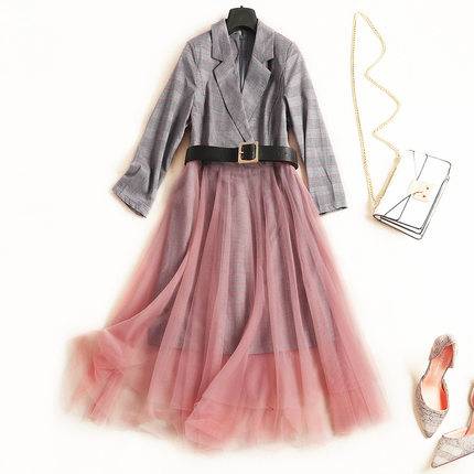 2018初秋新款女连衣裙西装领七分袖绑带高腰网纱半裙通勤裙