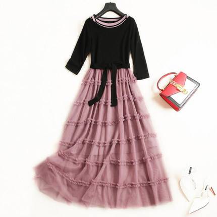 2018秋季女装新款长裙时尚修身显瘦木耳边拼接纯色网纱连衣裙