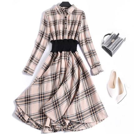 2018秋季新款格子连衣裙衬衫裙复古束腰中长款收腰修气质大摆裙