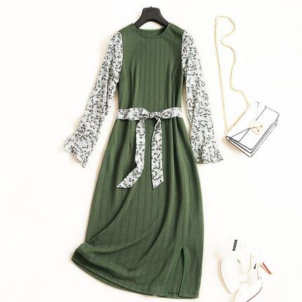 碎花连衣裙2018初秋新款女装圆领长袖高腰显瘦针织A字中长裙