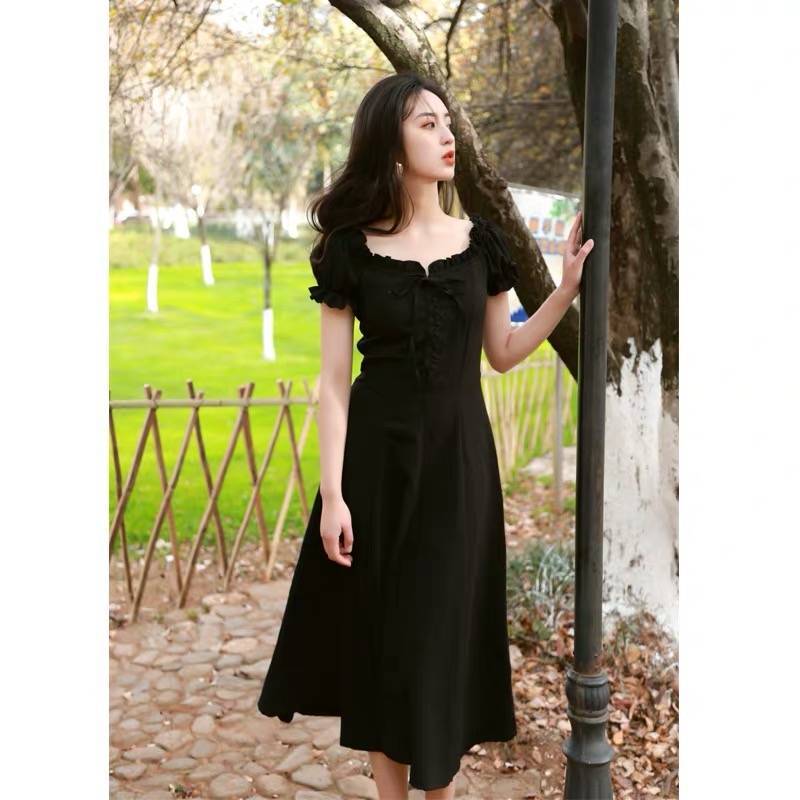 春夏季法式复古黑色连衣裙短袖桔梗长裙显瘦中长打底裙子气质少女