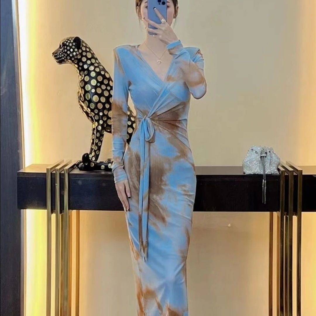 时尚v领气质温婉女人味轻奢连衣裙收腰新款系带修身百搭开衩长裙