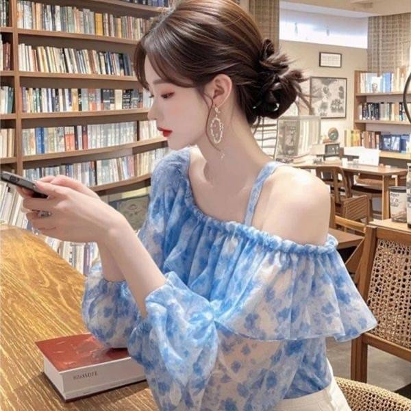 法式纯欲气质露肩吊带衬衫女新款设计感小众一字肩碎花百搭上衣