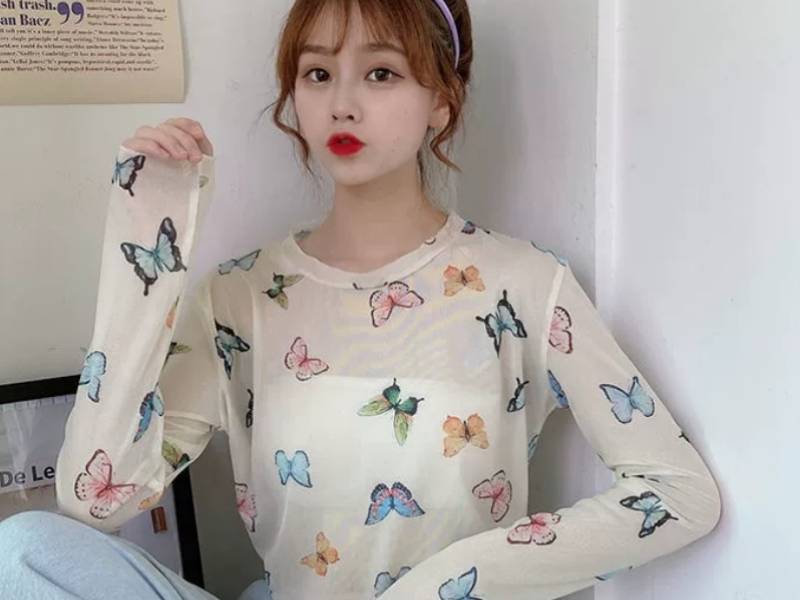 2024夏季新款ins薄款内搭网纱长袖t恤女蝴蝶上衣潮少女打底防晒衫 http: