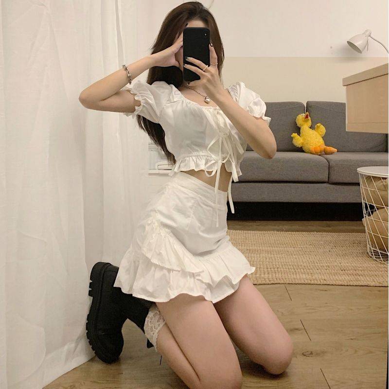 炸街套装裙2021韩版短款绑带上衣荷叶边半身裙式气质套装