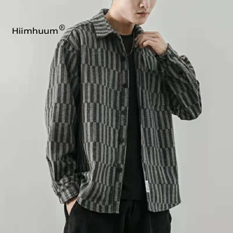 条纹衬衫男秋冬季日系休闲宽松外套加厚宽松衬衣ins潮牌毛呢上衣