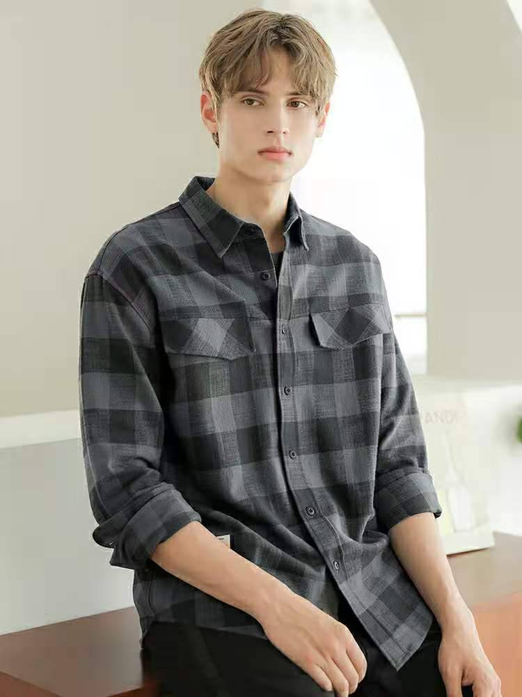 Markless气质灰格子衬衫男长袖宽松2020秋新款方领休闲衬衣潮外套