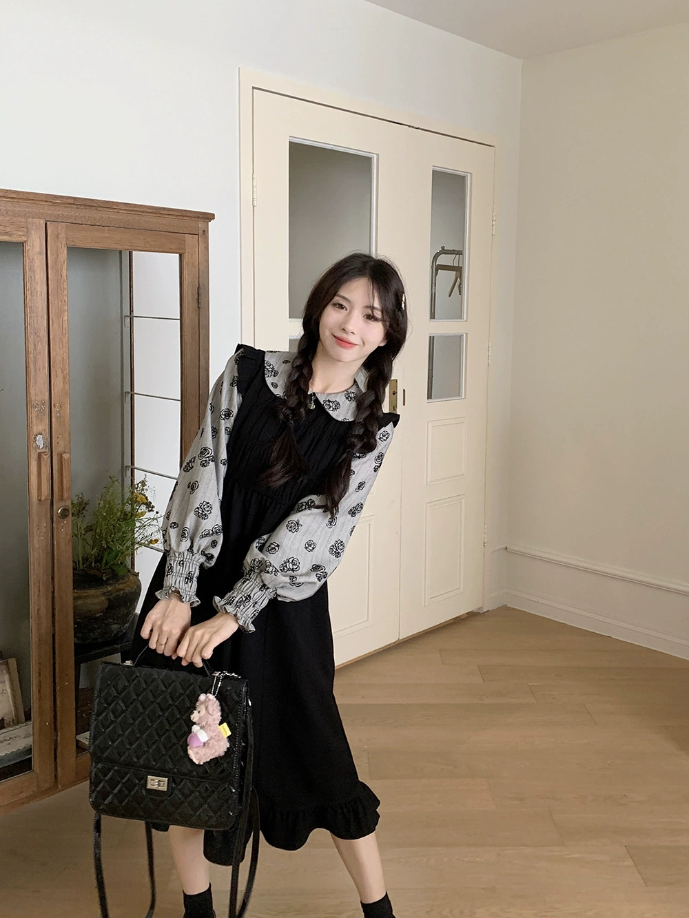 甜美娃娃领连衣裙2023秋新款大码女装拼接假两件长袖玫瑰植绒裙子