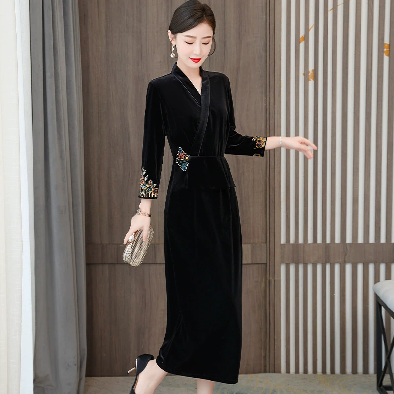 2023秋冬新款女装中式复古绣花金丝绒V领旗袍裙修身中国风连衣裙