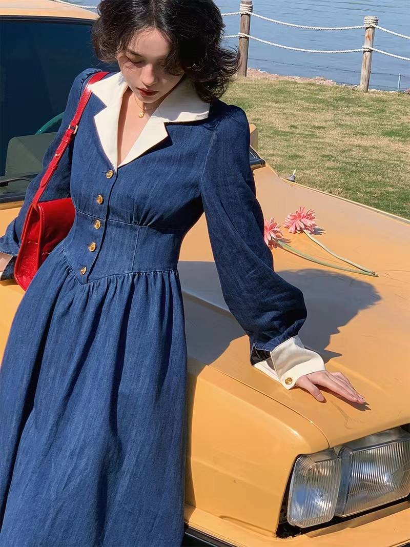 撞色拼接翻领牛仔衬衫收腰a字连衣裙 288.00 已售:0件