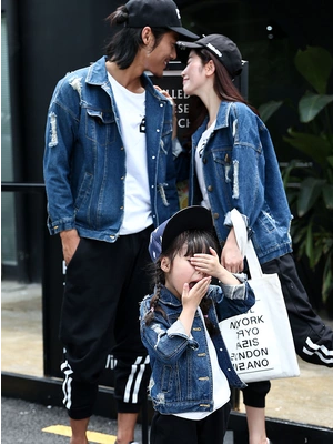 亲子装春秋韩版新潮破洞牛仔上衣全家装一家三口大码嘻哈牛仔外套