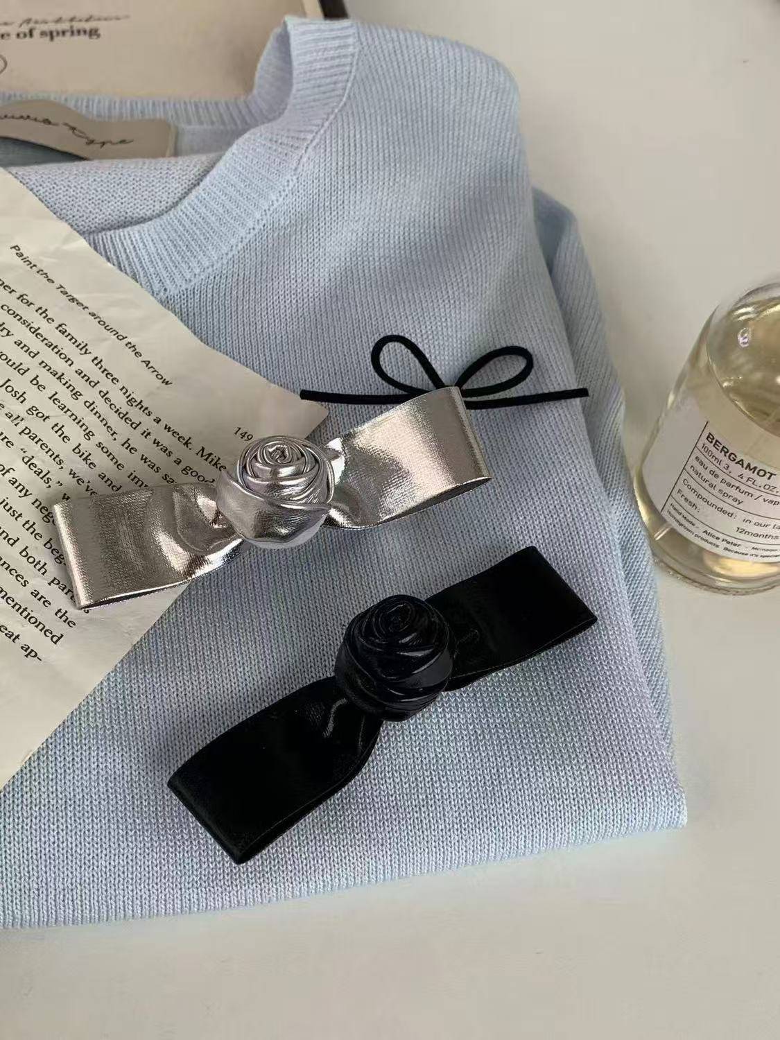 立体玫瑰蝴蝶结发夹韩国银色气质高级感小众鸭嘴刘海手工发饰