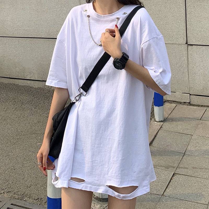 白色夏季新款韩版BF风个性链条下摆破洞宽松纯色短袖T恤女上衣潮