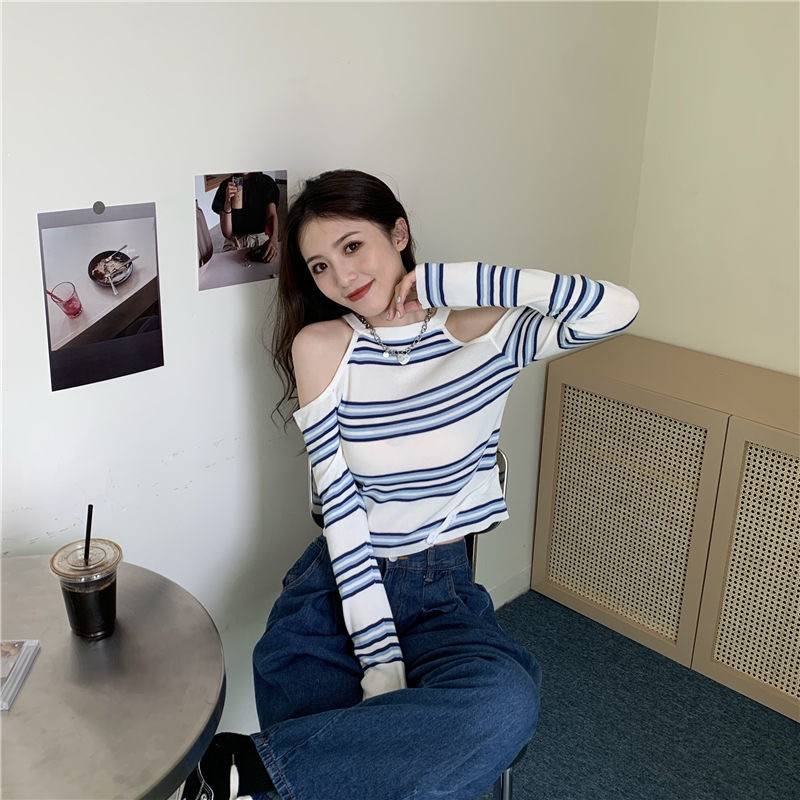 露肩小心机设计感长袖针织衫2020新款秋季女装修身挂脖条纹上衣潮