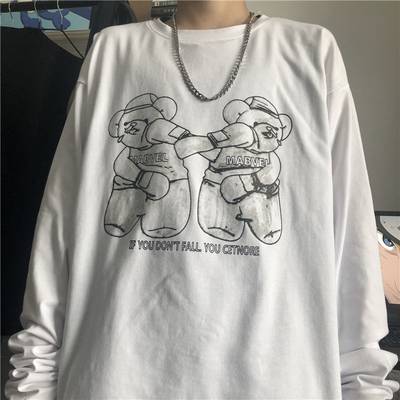 长袖t恤女韩版ins原宿风小熊印花打底衫内搭早秋新款白色百搭上衣
