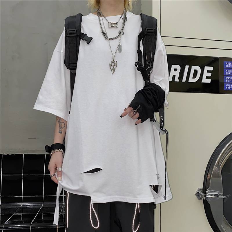 韩国ins夏季港风原宿高街破洞撕裂宽松纯色短袖T恤男女 富江潮流