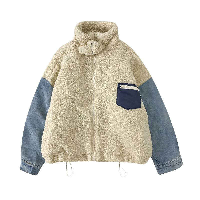 冬季韩版新款仿羊羔毛牛仔拼接宽松中长款设计感长袖棒球服外套女