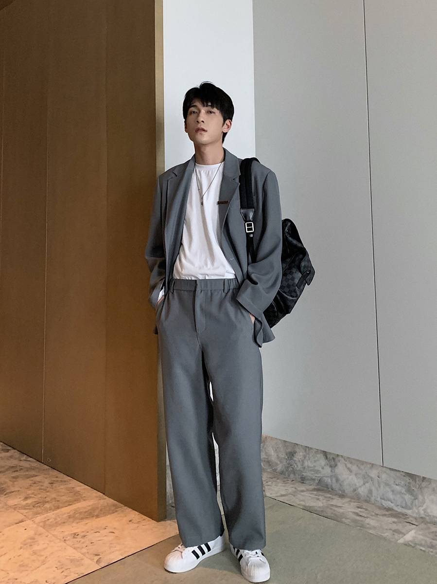 春秋痞帅男装套装潮流帅气宽松高级灰西装外套蓝色西服西裤