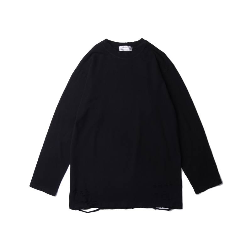 欧美高街嘻哈潮牌纯棉百搭打底衫宽松纯色刀割破洞长袖T恤男黑