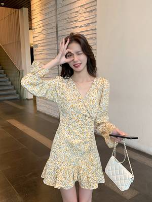小谷粒侧边抽皱鱼尾连衣裙2021新款夏季甜美温柔V领气质长袖短裙