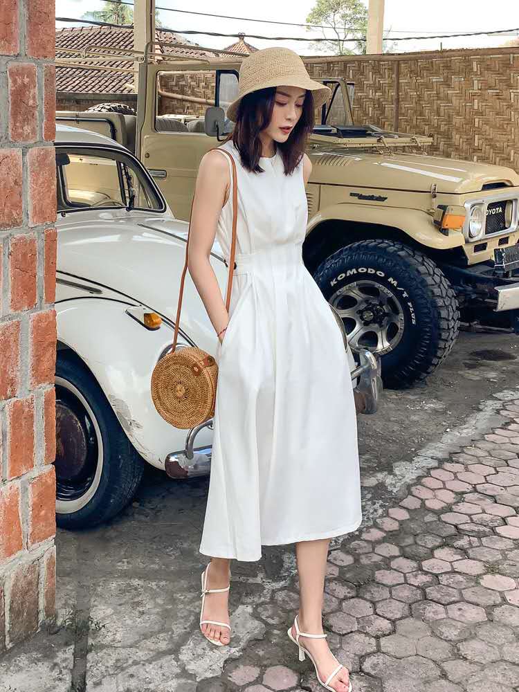 白色连衣裙2021新款夏季法式无袖收腰a字裙气质高级感冷淡风裙子
