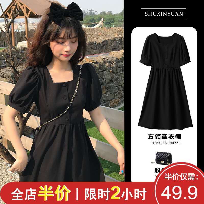 方领黑色连衣裙子2021年新款夏季大码女装微胖mm茶歇法式桔梗初恋