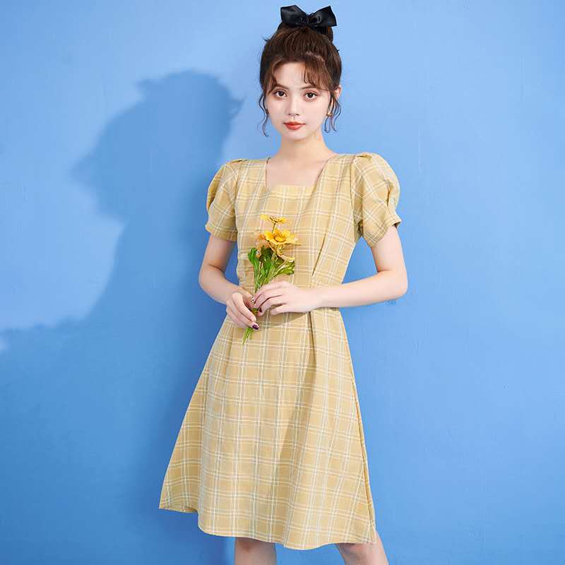 帛卡琪2021新款小仙女泡泡袖方领连衣裙女收腰系带学生格子中裙夏