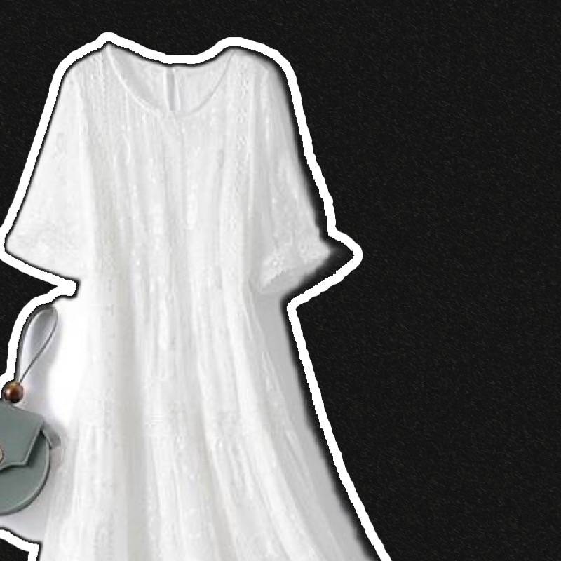乙默 2023春夏新款绣花纯棉中长袖雪纺下摆刺绣长款连衣裙