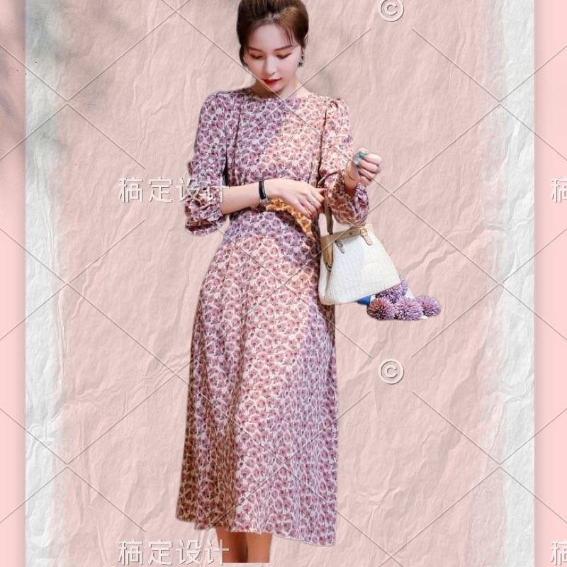 法式复古方领碎花连衣裙女2023秋收腰显瘦桔梗长裙仙女裙