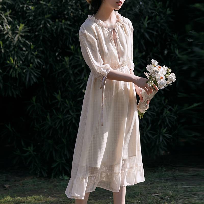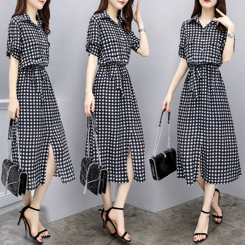 显瘦气质性感荷叶边五分袖格子雪纺连衣裙2018新款夏女
