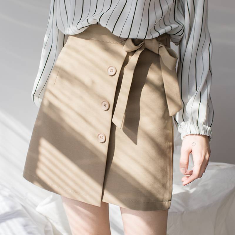 EGGKA排扣绑带不规则半身裙夏女高腰a字裙2018新款裙子包臀短裙裤