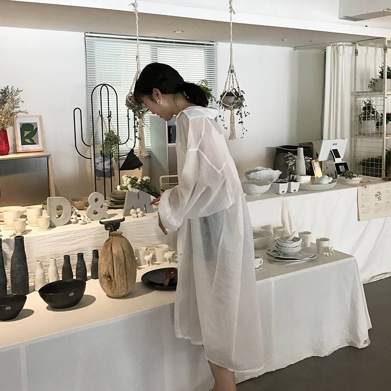 白色长款雪纺衬衫女长袖宽松夏季防晒衣中长款开衫薄款衬衣外套潮