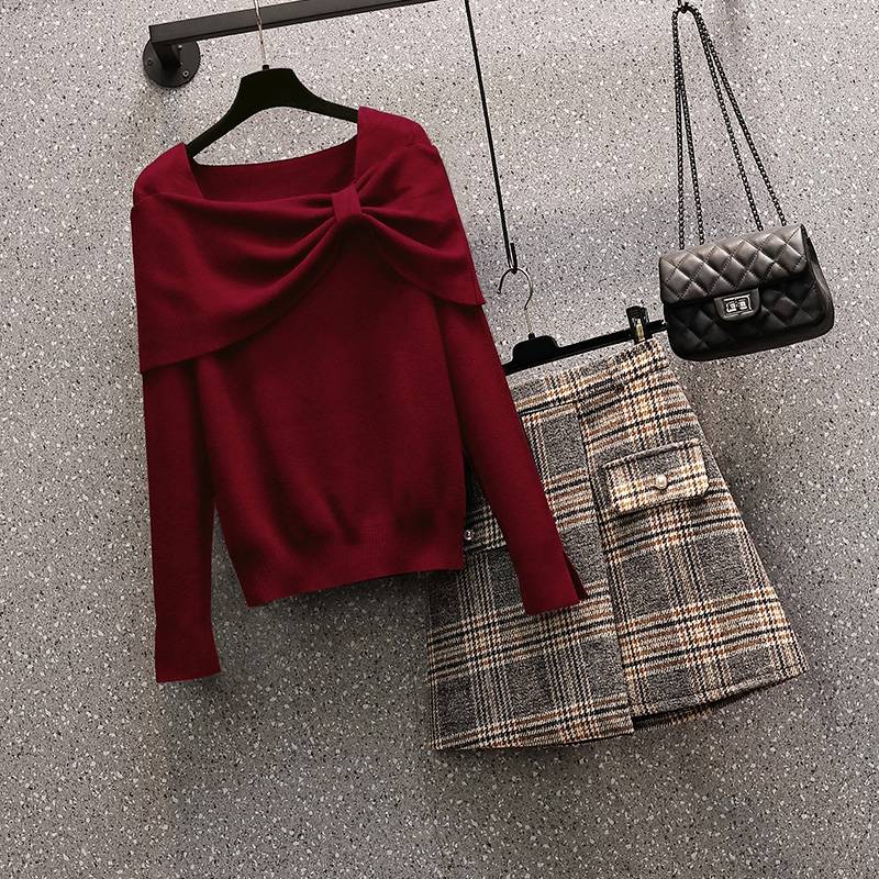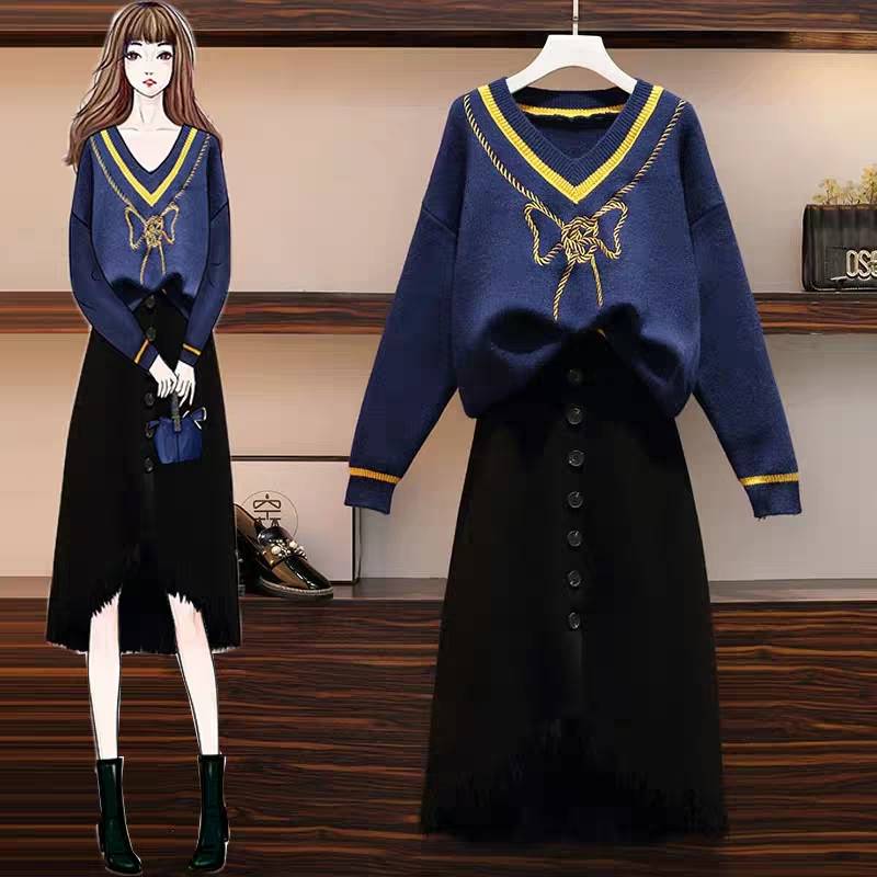 大码女装秋冬季裙子套装两件套洋气显瘦v领蝴蝶结针织衫毛衣上衣