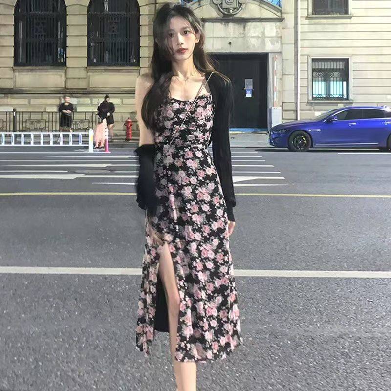 复古港风碎花吊带连衣裙套装女夏季防晒开衫辣妹纯欲开叉收腰长裙