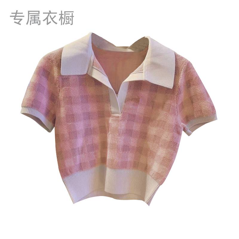 辣妹风甜美短款Polo领格子针织薄款T恤女夏季露脐短袖高腰bm上衣