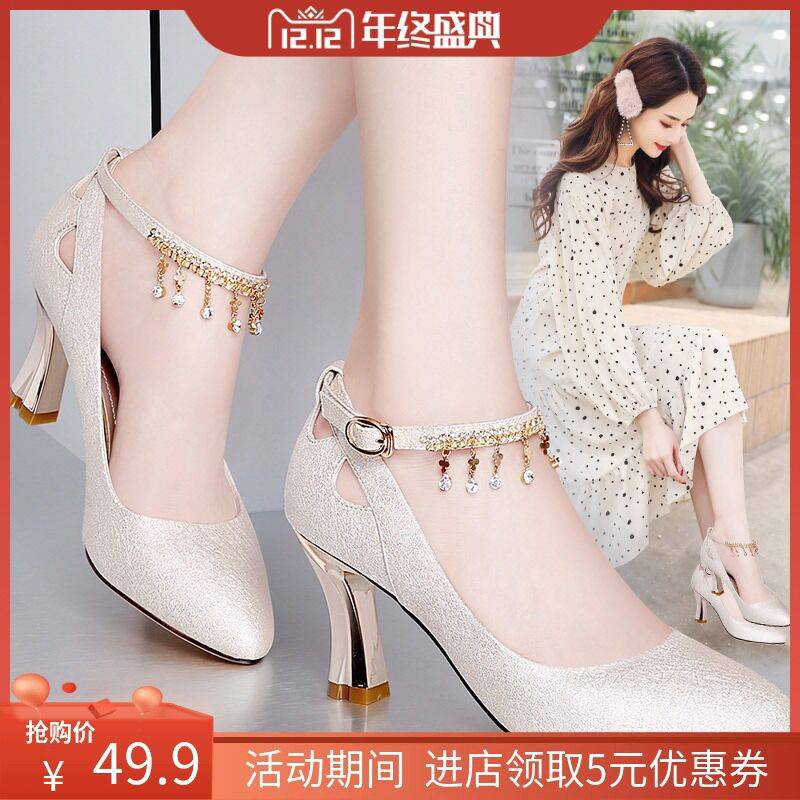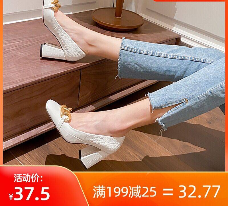 大东妞2021新款一字扣尖头高跟皮鞋女休闲中跟女士百搭浅口单鞋