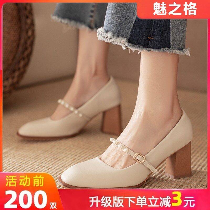 法式温柔珍珠高跟单鞋女2021春秋季新款百搭中跟粗跟复古玛丽珍鞋