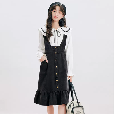 牛仔双色收腰背带裙2022夏季新款秋装女小个子乖巧气质连衣裙