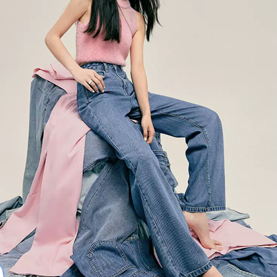 高腰直筒云朵牛仔裤2022夏女雅赛尔长裤粉色裤子宽松薄款阔腿