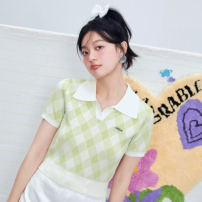 POLO领T恤格纹俏皮2022夏季新款冰丝短上衣针织短袖女夏