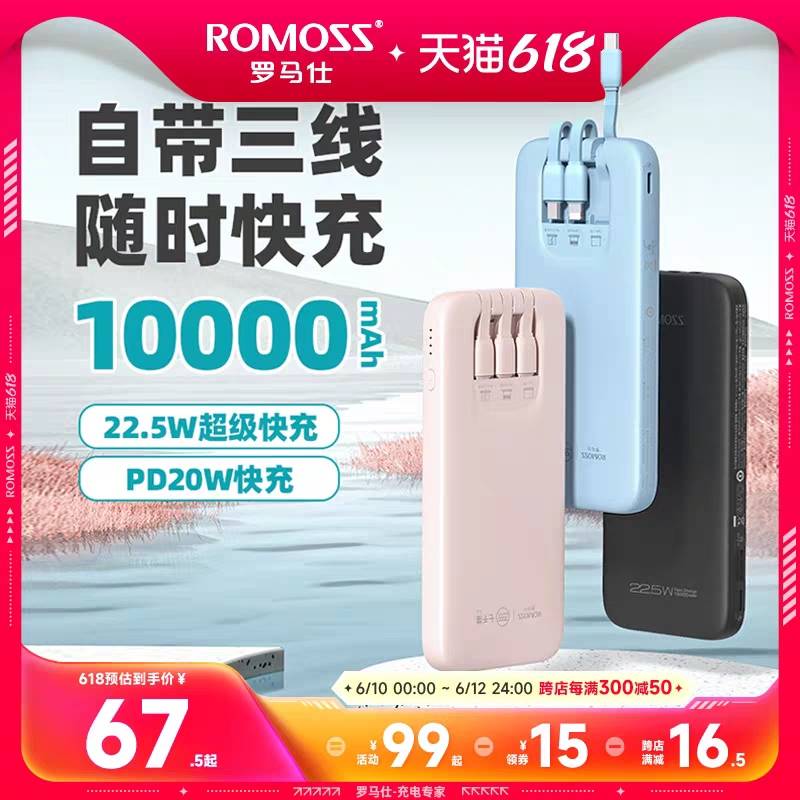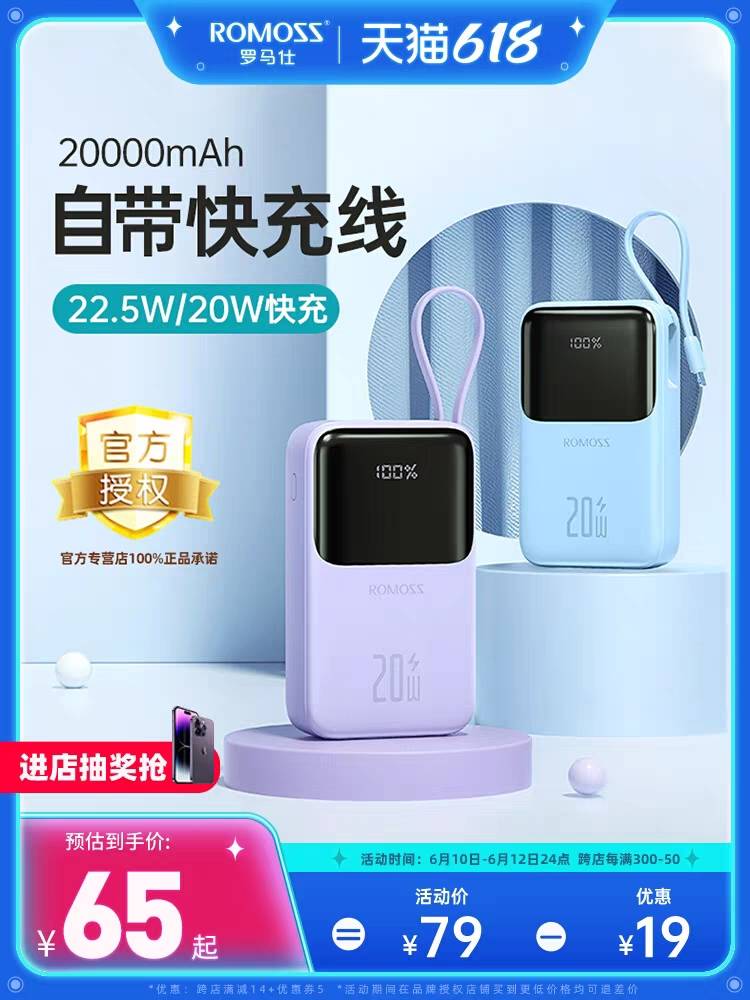 罗马仕新款超大容量充电宝20000毫安自带线超薄小巧便携