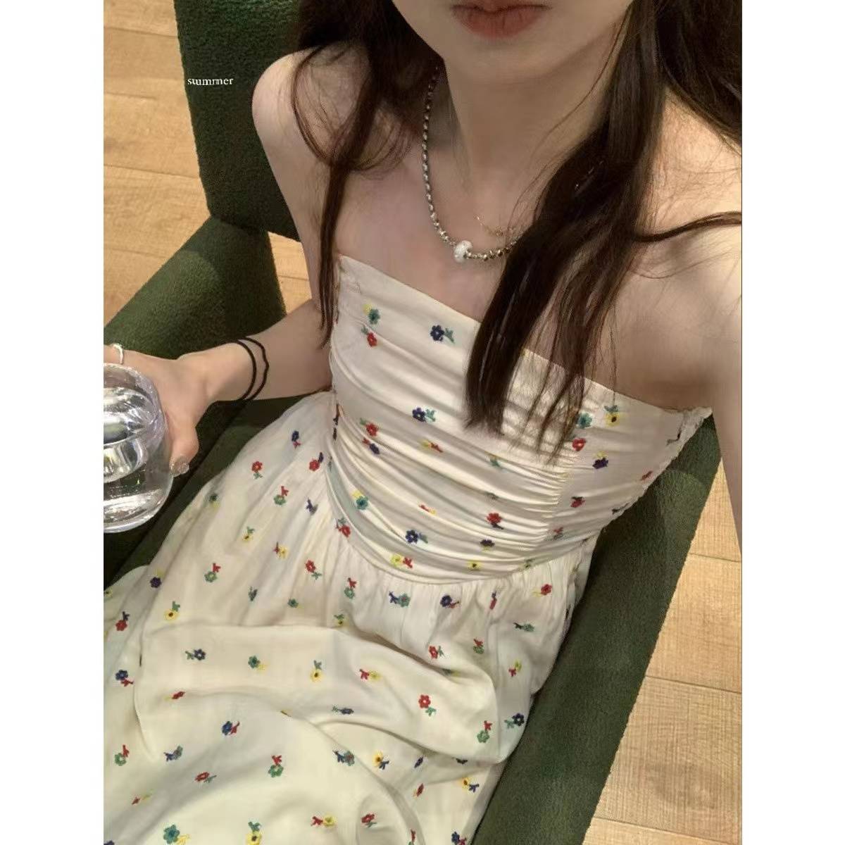 XXSZL假日感压褶抹胸连衣裙女春夏长款高腰显瘦吊带裹胸长裙航系